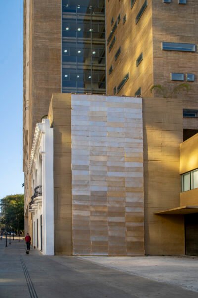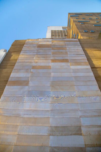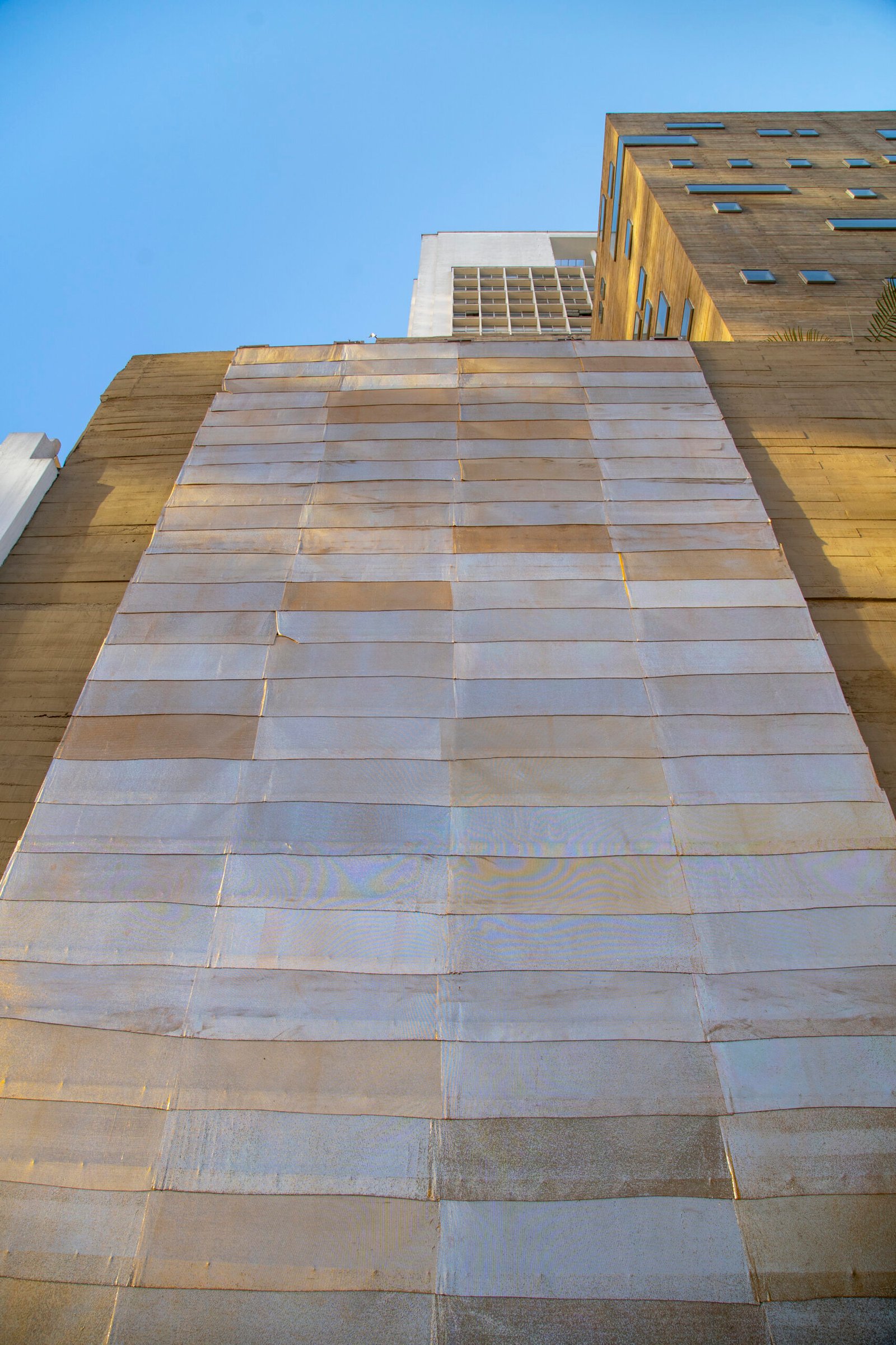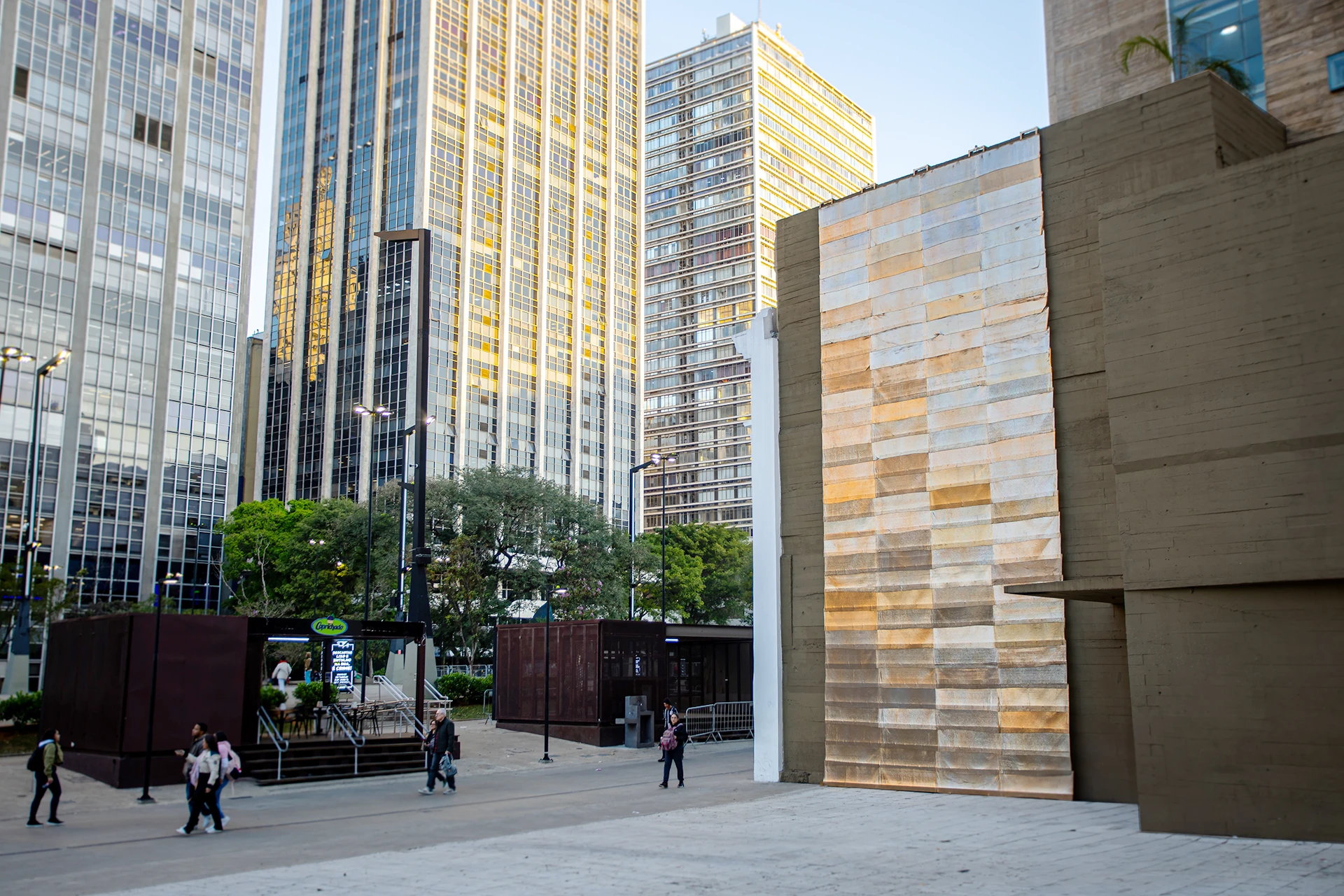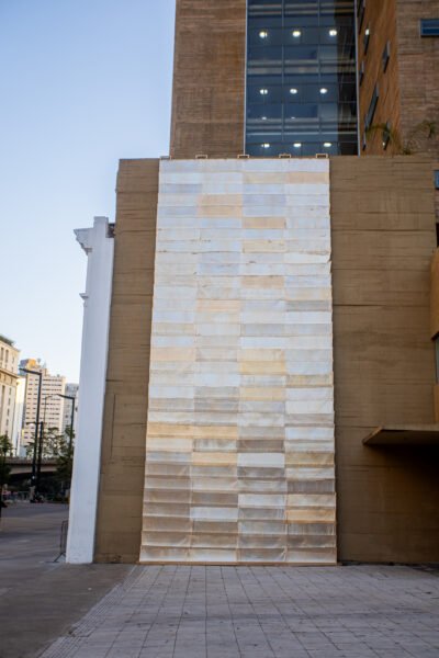 Por fim, a empena da Praça das Artes, coberta por essa malha de metal refletiva, amplia a escala do trabalho e aciona um diálogo com a arquitetura brutalista do centro de São Paulo. A verticalidade do prédio contrasta com a fluidez da luz, num jogo entre massa e superfície, entre opacidade e cintilância.