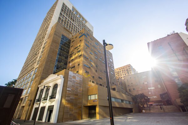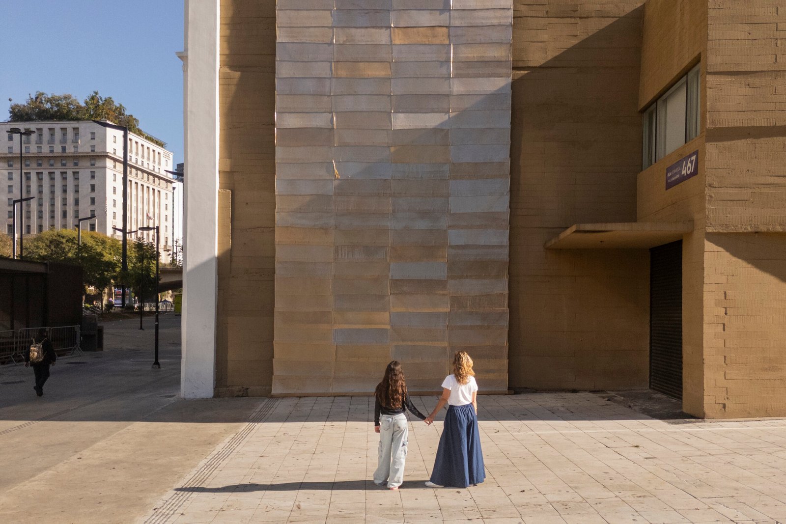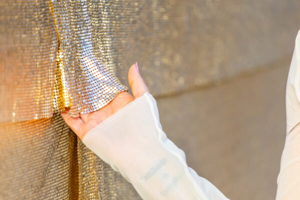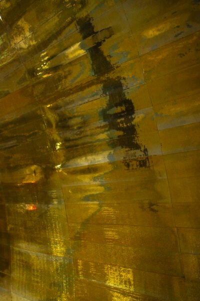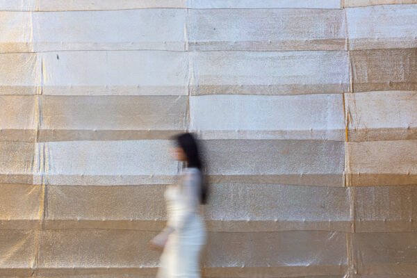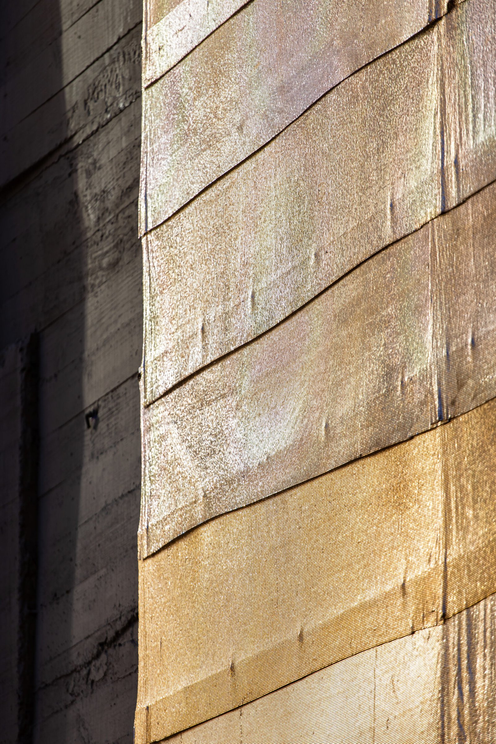 Por fim, a empena da Praça das Artes, coberta por essa malha de metal refletiva, amplia a escala do trabalho e aciona um diálogo com a arquitetura brutalista do centro de São Paulo. A verticalidade do prédio contrasta com a fluidez da luz, num jogo entre massa e superfície, entre opacidade e cintilância.