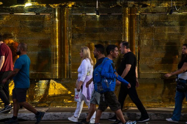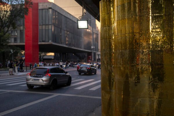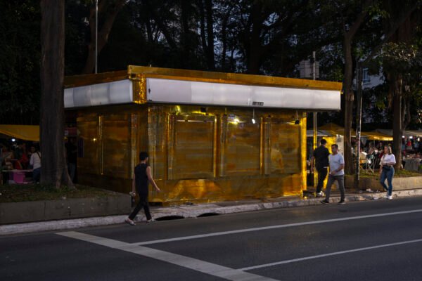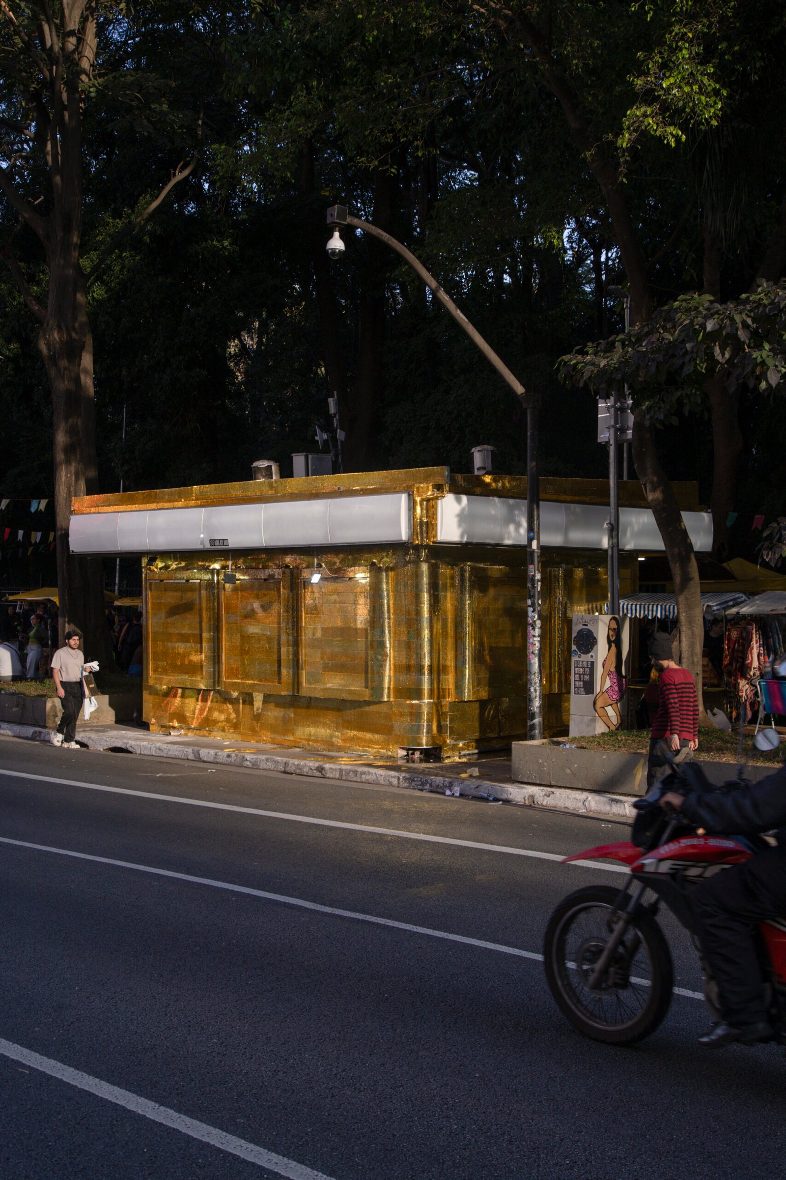 Já na Avenida Paulista, a banca de jornal — um elemento urbano frequentemente invisibilizado — ganha destaque com o revestimento dourado vibrante e texturizado. A cor atualiza o brilho como símbolo de desejo, consumo e memória. É um gesto de valorização do banal, que revela como o luxo pode ser uma questão de presença e intenção, não de valor monetário.