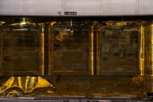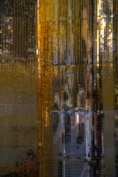 Utilizando materiais espelhados e superfícies cintilantes nesses locais de passagem, Rizza reveste estruturas arquitetônicas cotidianas com uma pele de luz. O brilho, aqui, não é metáfora: é fenômeno óptico e simbólico que atravessa espécies. Tanto humanos quanto animais são atraídos pelo reluzente — um dado instintivo que a artista reativa como poética urbana. Nesse sentido, as obras não apenas ocupam a cidade, mas a reencantam, convocando olhares para lugares esquecidos ou desgastados, frequentemente nem percebidos por nós durante travessias cotidianas.