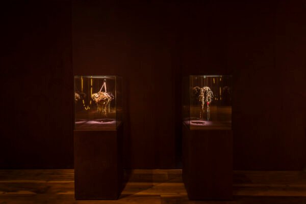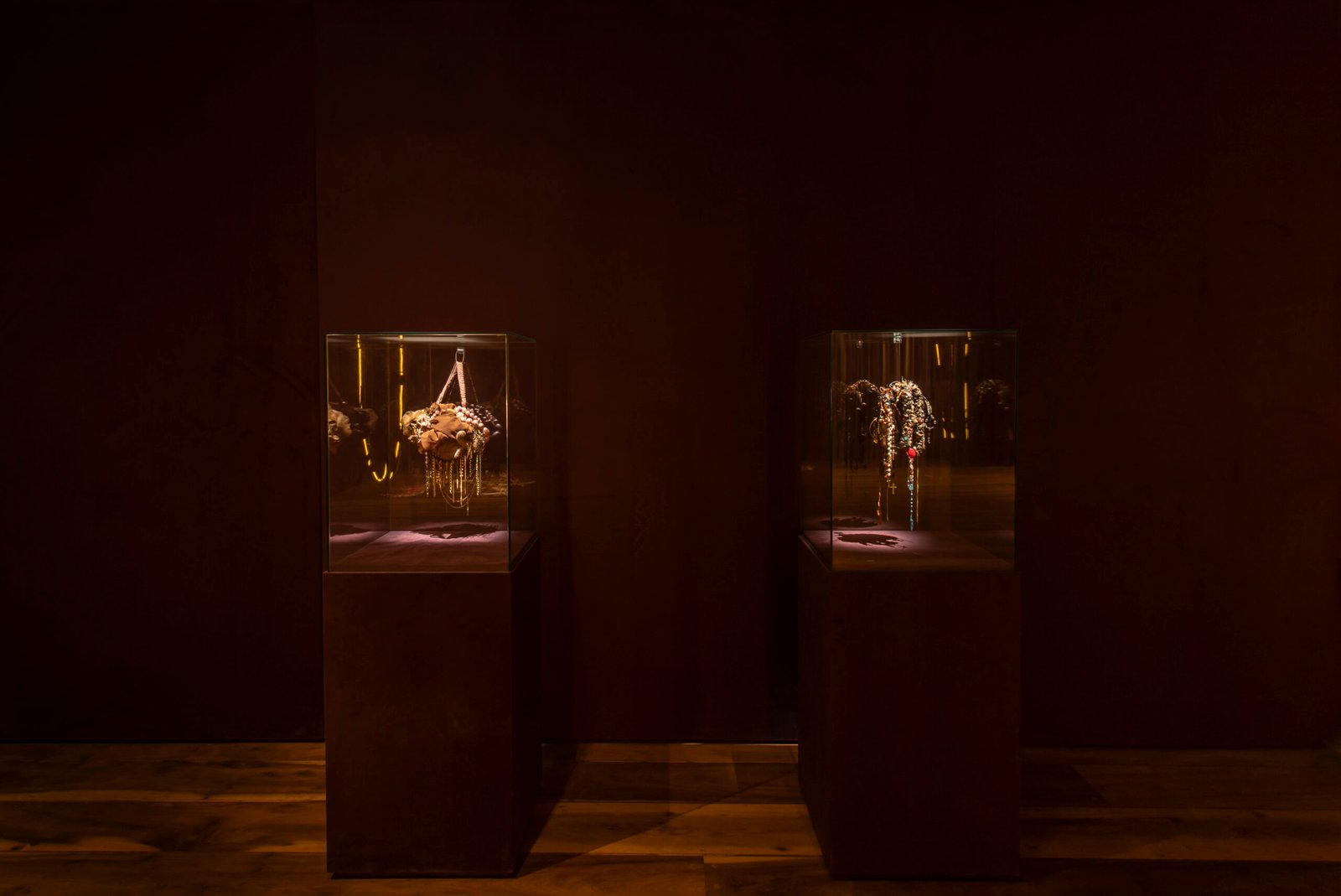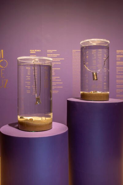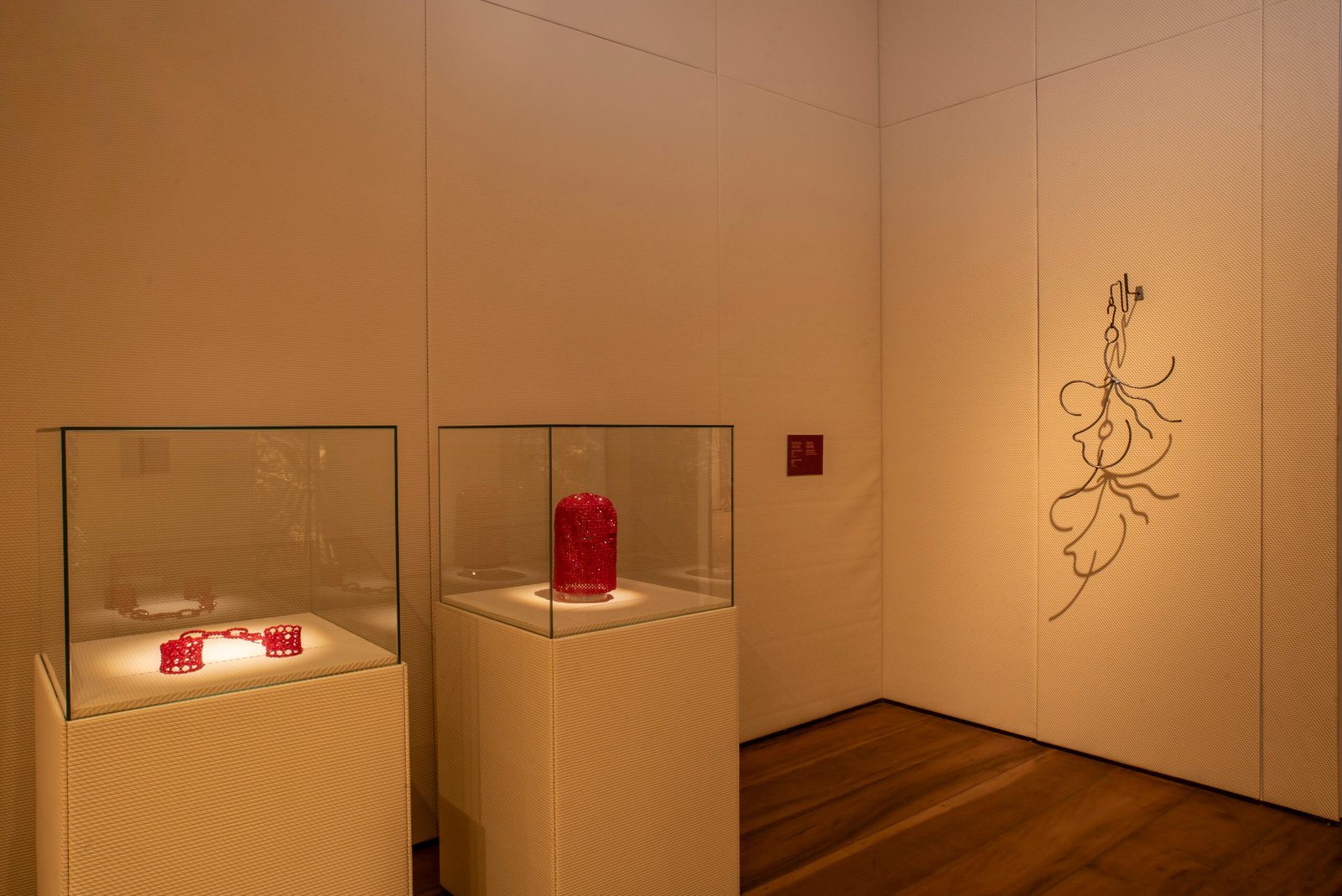 Inaugura-se o percurso expositivo iluminando-se os extremos do tempo e da sensibilidade material com um colar de sementes do Museu do Homem Americano — testemunho ancestral do uso simbólico do corpo — e uma série de joias e obras de Amélia Toledo — artista que, ao integrar minerais e formas orgânicas, reinventou o adornar como linguagem vital. Assim evoca-se o elo entre natureza, criação, identidade e o feminino.